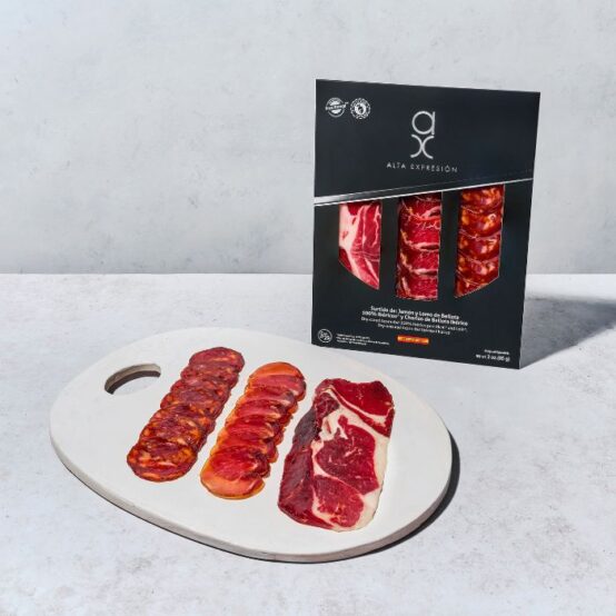 Experience the unique flavors of Alta Expresión: a sampler of acorn-fed Ibérico ham, loin, and chorizo. Taste the pinnacle of Spanish tradition.